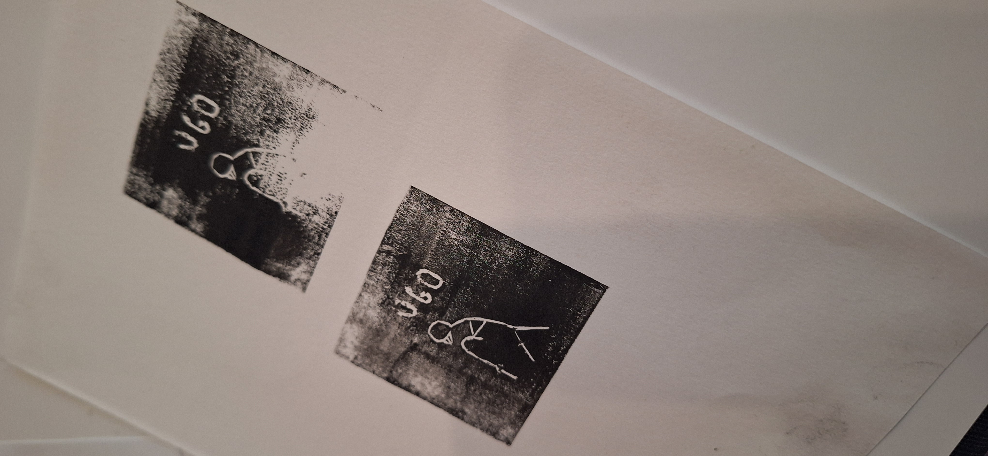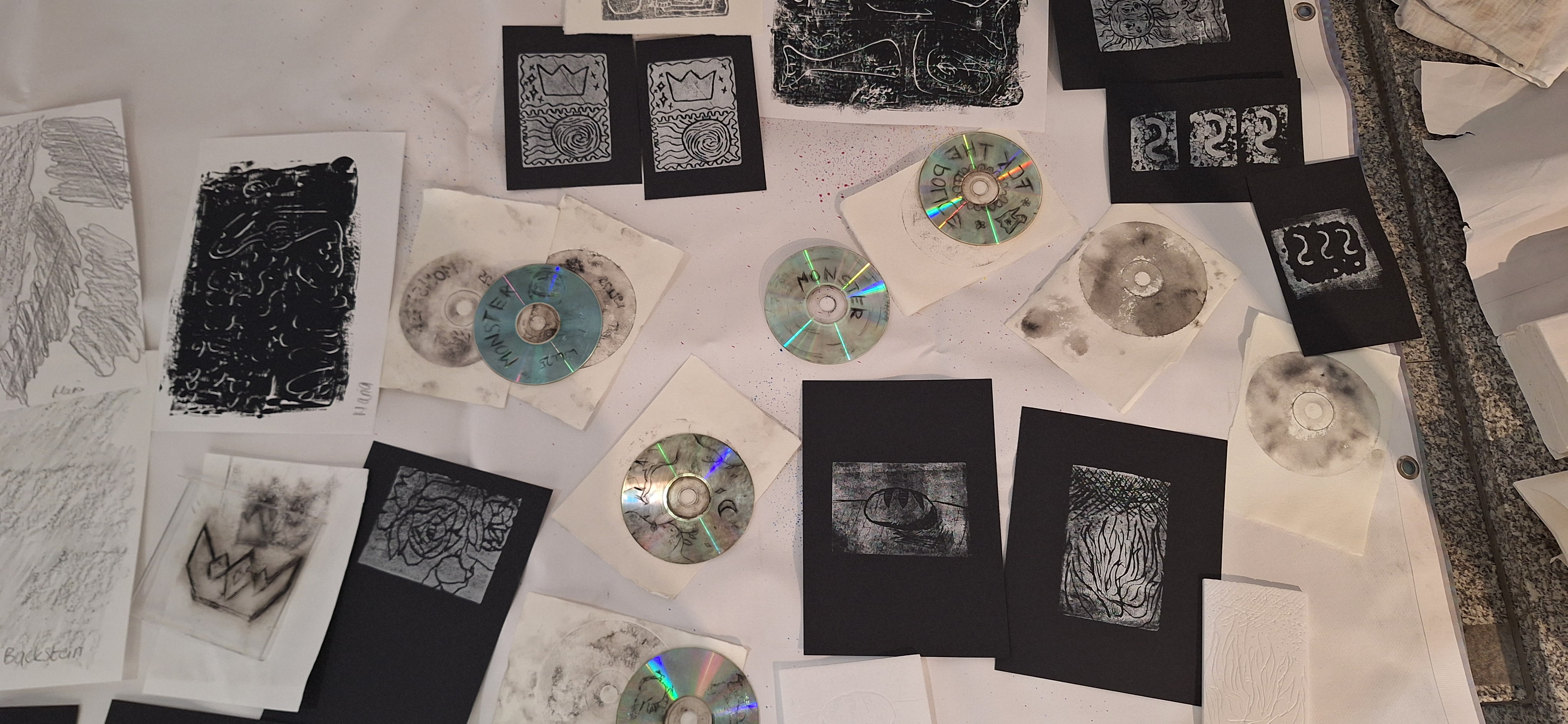 Im anschließenden praktischen Teil erhielten die Schülerinnen und Schüler die Möglichkeit, eigene künstlerische Arbeiten zu entwickeln. Dabei orientierten sie sich an den in der Ausstellung gezeigten Ansätzen und arbeiteten mit einfachen Materialien und alltäglichen Fundstücken (sog. Readymates). Durch gezielte Eingriffe und Umgestaltungen wurden diese Materialien in neue Zusammenhänge überführt und durch die Technik des Drucks in Werke umgewandelt.