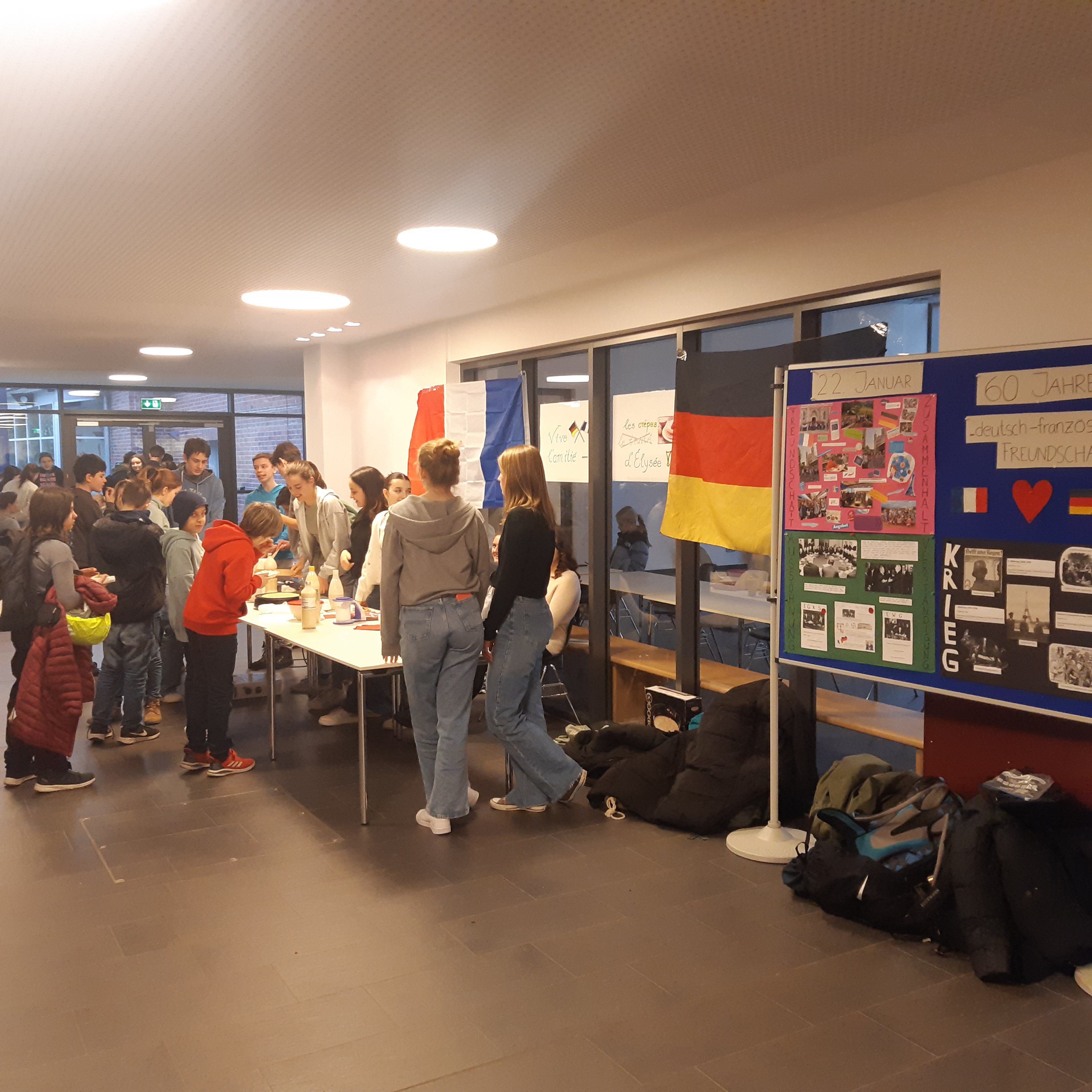Aus Anlass des Jubiläums haben einige Französischklassen heute Crêpes gebacken, die sie umsonst in der Schule verteilten. Neben dem leckeren Duft von Zimt und frisch gebackenen Crêpes trug auch die schöne französische Musik von Joe Dassin dazu bei, dass sich überall in der Schule eine fröhliche und lockere Stimmung verbreitete.