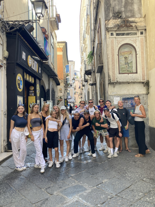 Die 12s hatte keine Strapazen gescheut, um eine Studienfahrt nach Casal Velino, südlich von Salerno, zu unternehmen. Die lange Reise über Berlin mit Bahn, Flugzeug und Bus wurde erschwert durch zahlreiche Verspätungen, überfüllte Züge und hektisches Umsteigen – kein Grund für die Schülerinnen und Schüler, sich aus der Ruhe bringen zu lassen. Vor Ort stand dann ein abwechslungsreiches Programm an: Schnorcheln, Klippenspringen, Wandern, eine Sunset-Kajaktour und die Besichtigung von Salerno und der Ausgrabungsstätte Paestum. Ganz nebenbei gab es viel über die süditalienische Lebensart zu lernen, natürlich immer begleitet von viel Pasta, Pizza, Sonne und Meer.