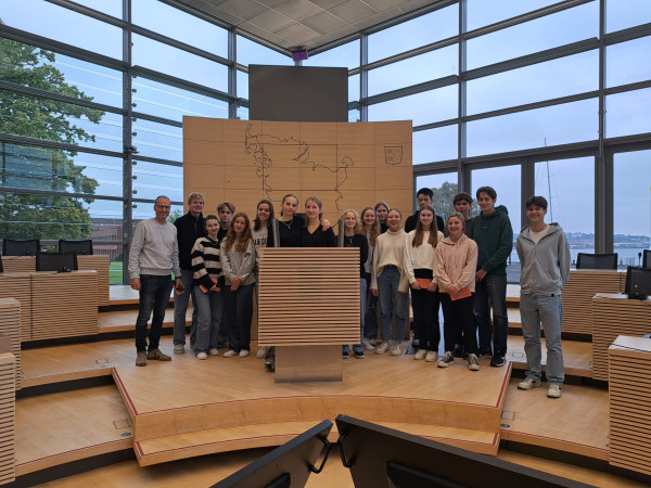 Am 6. Oktober besuchte der Wahlpflichtkurs "Europa" den schleswig-holsteinischen Landtag in Kiel. Nach einem kurzen Vortrag über die Geschichte des imposanten Gebäudes aus der Kaiserzeit mit dem modernen Glasanbau, in dem sich der Plenarsaal mit Blick auf die Kieler Förde befindet, hatten die Schülerinnen und Schüler eine Stunde lang Zeit, mit dem sozialdemokratischen Landtagsabgeordneten Martin Habersaat zu diskutieren. Die Schülerinnen und Schüler stellten Fragen zu fast allen Themen der Landes- und Bundespolitik, auf die Herr Habersaat ausführlich antwortete. Es war eine sehr interessante und lehrreiche Exkursion zu einem "außerschulischen Lernort".