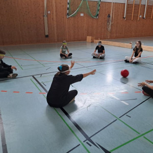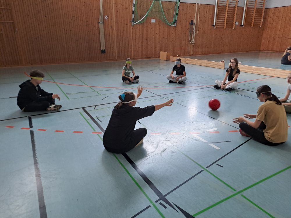 So konnten die Schülerinnen und Schüler „Goalball“ kennenlernen und ausprobieren: Mit verbundenen Augen und auf dem Boden sitzend mussten sie einen mit einem Glöckchen versehenen Ball in das gegnerische Tor schießen.