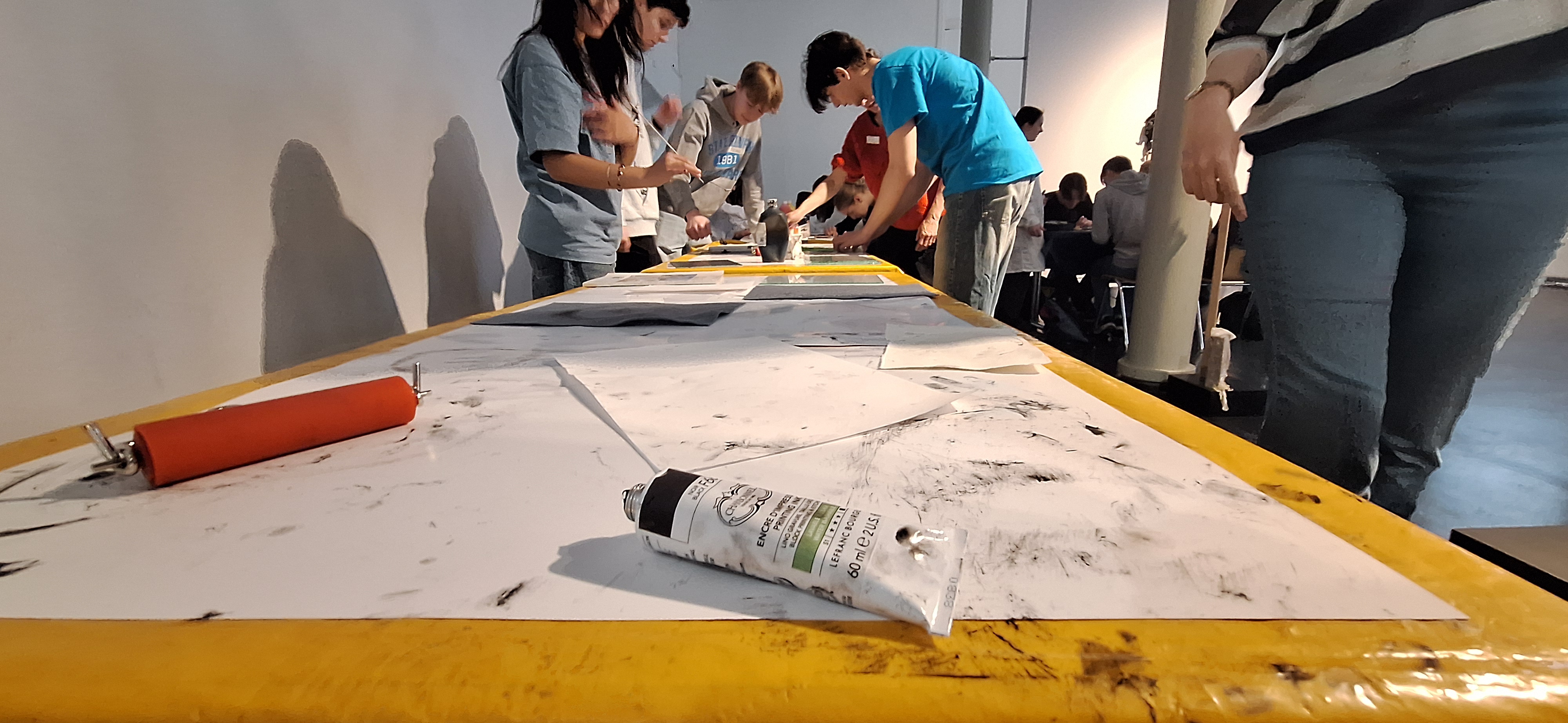 Im anschließenden praktischen Teil erhielten die Schülerinnen und Schüler die Möglichkeit, eigene künstlerische Arbeiten zu entwickeln. Dabei orientierten sie sich an den in der Ausstellung gezeigten Ansätzen und arbeiteten mit einfachen Materialien und alltäglichen Fundstücken (sog. Readymates). Durch gezielte Eingriffe und Umgestaltungen wurden diese Materialien in neue Zusammenhänge überführt und durch die Technik des Drucks in Werke umgewandelt.