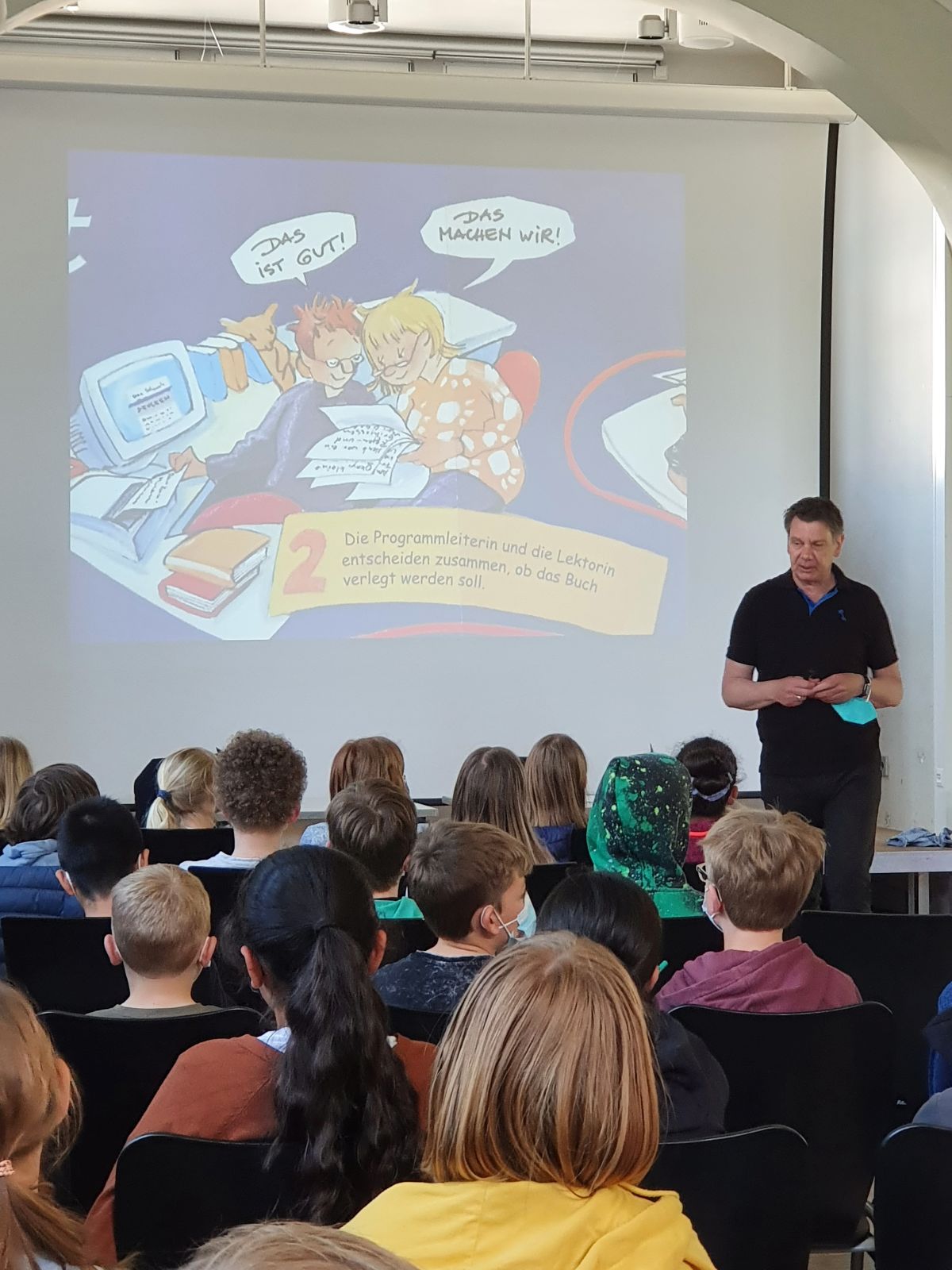 Diese Lesung war der Gewinn eines Preisausschreibens der Buchhandlung Stojan anlässlich des „Welttags des Buches“ (23.4.). Dabei hatte die Stormarnschule Glück und konnte deshalb den Autor live vor Ort begrüßen. Auf diese Weise erhielten die Schülerinnen und Schüler nicht nur einen Einblick in seine „Young detectives“-Reihe, sondern durften auch erfahren, wie viele Schritte nötig sind, damit aus einer Idee ein Buch und vielleicht sogar ein Bestseller wird.