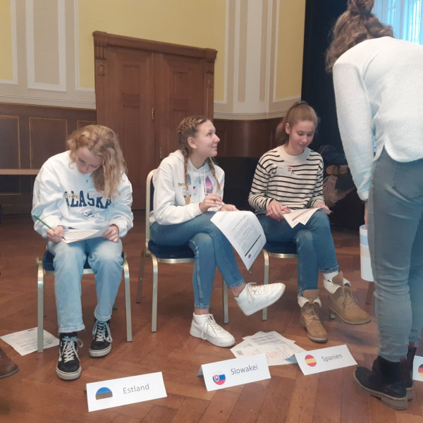 Dabei lernten die Schülerinnen und Schüler auf sehr interaktive und spielerische Weise die europäischen Institutionen kennen und führten in zwei Gruppen Rollenspiele zu den Themen Energie- und Migrationspolitik durch. Es wurde ein EU-Ministerratstreffen simuliert, bei dem jeder Teilnehmer in die Rolle eines EU-Wirtschaftsministers schlüpfen und aus dessen Perspektive die Verhandlungen in Brüssel führen musste.